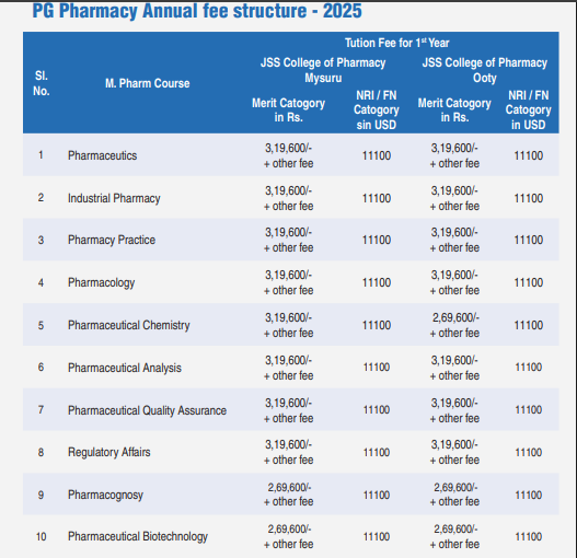 JSS Academy of Higher Education & Research Mysore M.Pharm Pharmaceutical Analysis is offered as 2 Years Full Time program, with total intake of 15 seats. The minimum eligibility criteria for M.Pharm is B.Pharm.+ GPAT. The total fees for JSS Academy of Higher Education & Research Mysore M.Pharm Pharmaceutical Analysis in 2025 is ₹ 6.39 Lakhs for the complete course duration, which includes total tuition fees of ₹ 6.39 Lakhs. Earlier, the fees in 2024 - 2025 for M.Pharm Pharmaceutical Analysis was ₹ 6.13 Lakhs.