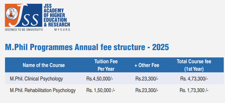 JSS Academy of Higher Education & Research Mysore M.Phil Clinical Psychology fees in first year is ₹ 4.73 Lakhs. The detailed fees is mentioned below.JSS Academy of Higher Education & Research Mysore Hostel Fee is ₹ 1.87 Lakhs.