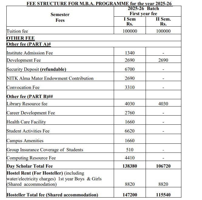 Earlier, MBA fees at NIT Surathkal was ₹ 4.64 Lakhs (in 2024) for the entire course duration. This shows a fee decrease of ₹ 19,047 over the year.