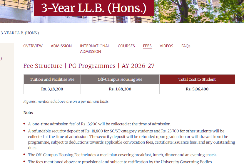 Earlier, L.L.B {Hons.} fees at NLSIU was ₹ 10.47 Lakhs (in 2025) for the entire course duration. This shows a fee increase of ₹ 5.1 Lakhs over the year.