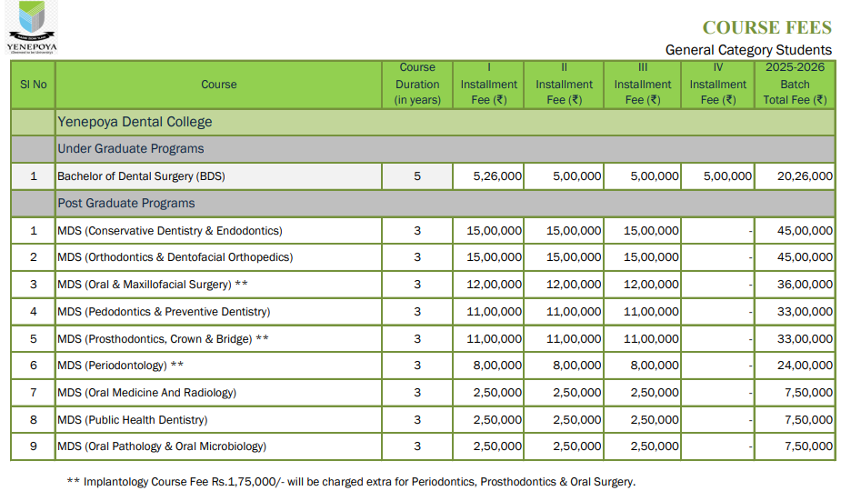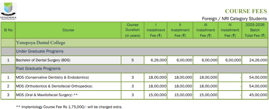 For students applying under the NRI quota for admission, the total course fee for MDS Orthodontics and Dentofacial Orthopedics at Yenepoya University Mangalore is ₹ 54.26 Lakhs.