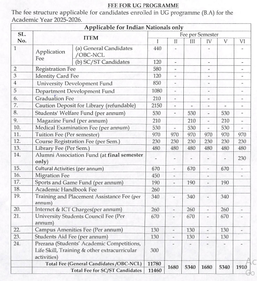 The faculty are highly qualified, knowledgeable, and supportive, although the choice of optional papers is limited due to fewer students and faculty members. Established under the Central Universities Act of 2009, the institution offers quality education with affordable fees. The total course fee for a BA is under 15,000 INR for three years, excluding hostel fees. The admission fee is Rs. 9,654, and semester fees range from Rs. 2,000 to Rs. 3,000, with the first semester costing around Rs. 8,000 to Rs. 9,000 due to one-time charges.