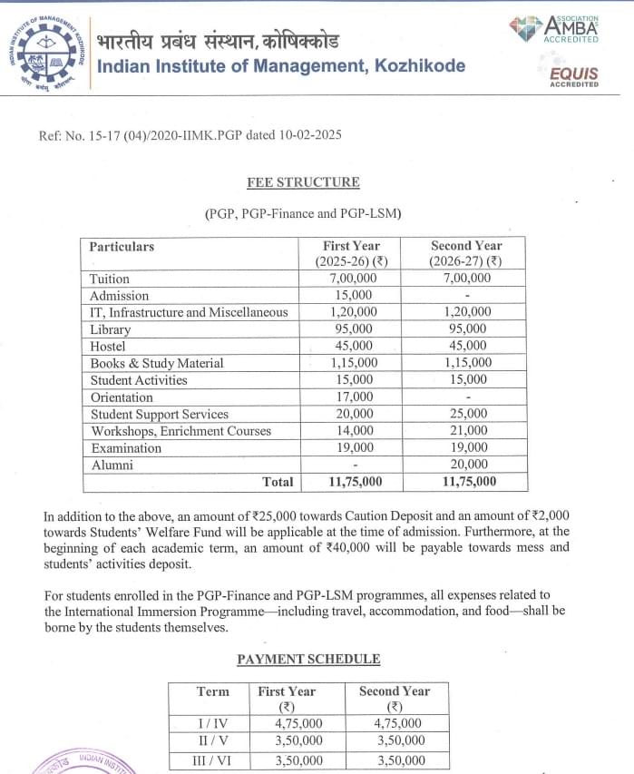 Earlier, PGP LSM Liberal Studies fees at IIM Kozhikode was ₹ 20.5 Lakhs (in 2024) for the entire course duration. This shows a fee increase of ₹ 3.27 Lakhs over the year.