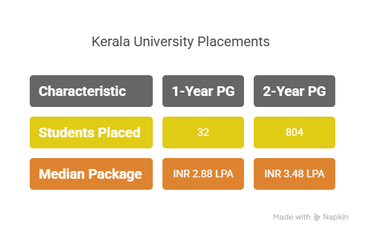 Kerala University Placement Report 2025 has not been released yet. As per Kerala University NIRF Report 2025, the 1Year PG Program witnessed 32 students being placed, with a median package of INR 2.8 LPA. For the 2Year PG program, a median package of INR 3.48 LPA was recorded for 804 placed students.