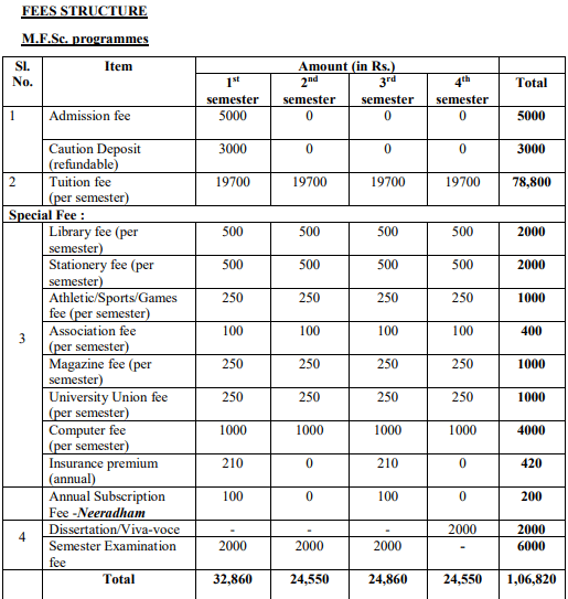 KUFOS M.F.Sc Aquatic Animal Health Management is offered as 2 Years Full Time program, with total intake of 11 seats. The minimum eligibility criteria for M.F.Sc is B.F.Sc. + AIEEA (PG). The total fees for KUFOS M.F.Sc Aquatic Animal Health Management in 2025 is ₹ 1.07 Lakhs for the complete course duration, which includes total tuition fees of ₹ 78,800. Earlier, the fees in 2024 - 2025 for M.F.Sc Aquatic Animal Health Management was ₹ 98,620.