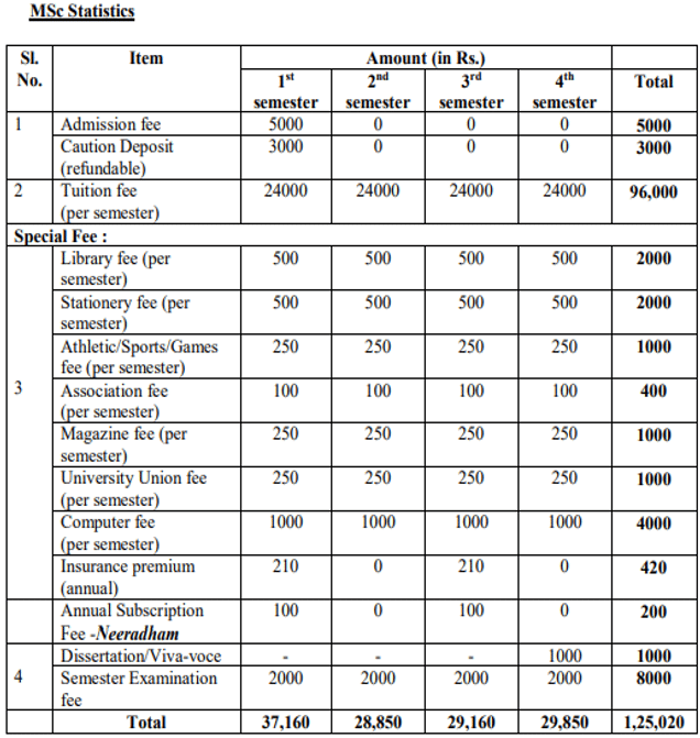 KUFOS M.Sc Statistics is offered as 2 Years Full Time program, with total intake of 12 seats. The minimum eligibility criteria for M.Sc is Graduation with 55%. The total fees for KUFOS M.Sc Statistics in 2025 is ₹ 1.25 Lakhs for the complete course duration, which includes total tuition fees of ₹ 96,000. Earlier, the fees in 2024 - 2025 for M.Sc Statistics was ₹ 1.25 Lakhs.