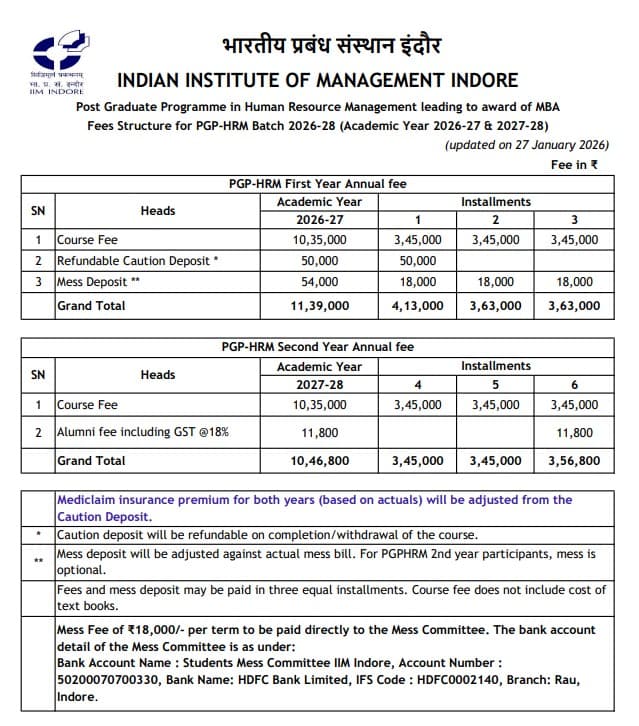Earlier, PGPM Human Resources fees at IIM Indore was ₹ 18.42 Lakhs (in 2025) for the entire course duration. This shows a fee increase of ₹ 3.44 Lakhs over the year.