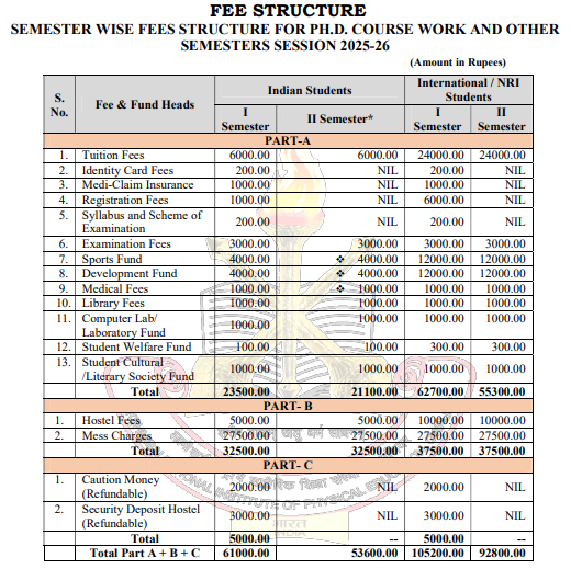 LNIPE Ph.D Physical Education is offered as 3 Years Full Time program. The minimum eligibility criteria for Ph.D is Post Graduation with 55%+JRF/NET. The total fees for LNIPE Ph.D Physical Education in 2025 is ₹ 1.31 Lakhs for the complete course duration, which includes total tuition fees of ₹ 36,000. Earlier, the fees in 2024 - 2025 for Ph.D Physical Education was ₹ 1.34 Lakhs.