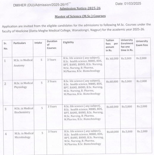 DMIMS offers a total of 5 seats for M.Sc Medical Microbiology. Check DMIMS Admission 2025