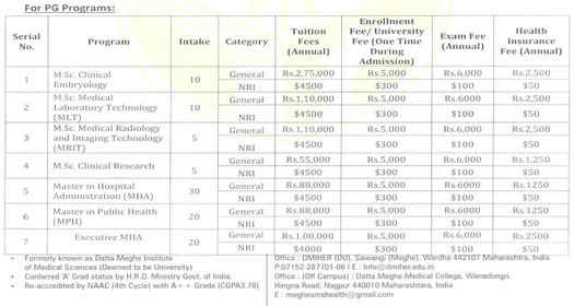 DMIMS MPH fees in first year is ₹ 1.28 Lakhs. The detailed fees is mentioned below.DMIMS Hostel Fee for Male is ₹ 3.3 Lakhs. Hostel Fee for Female at DMIMS is ₹ 4.09 Lakhs.