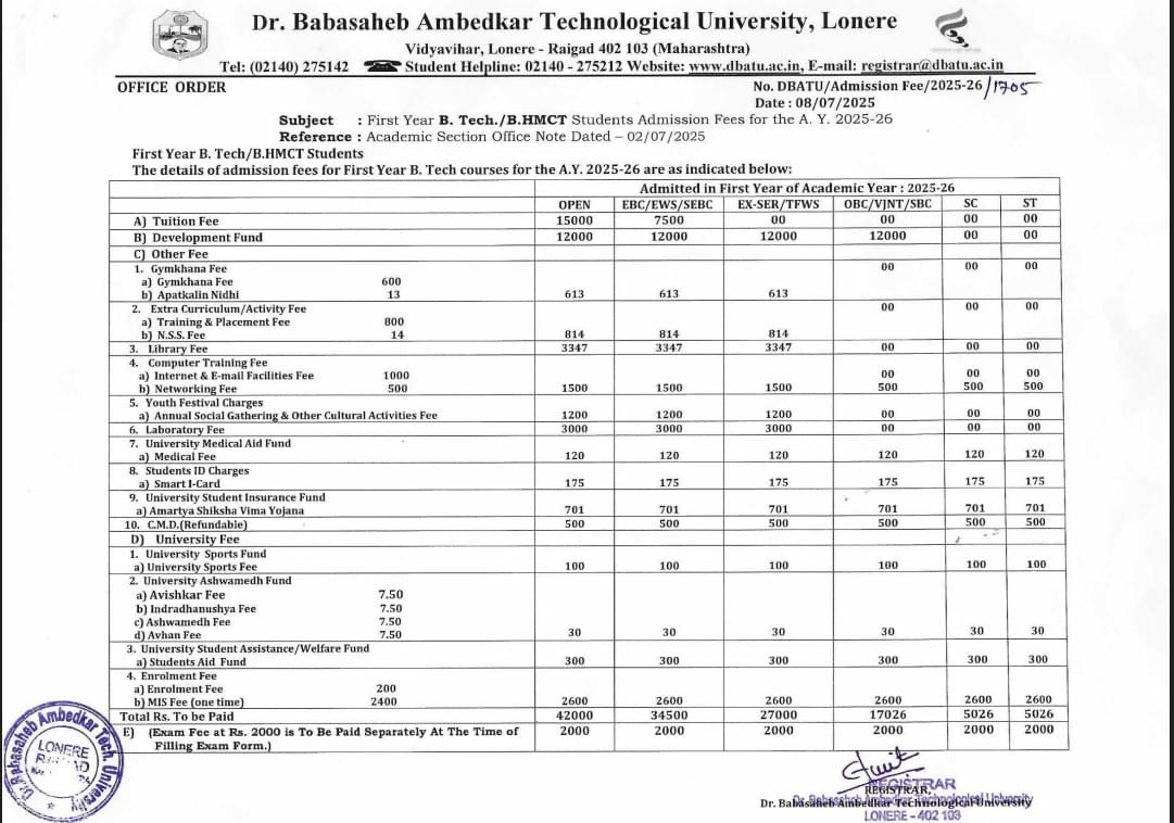 11 Jul, 2025 DBATU has released the Fee Structure 2025-26 for BHMCT program. The academic fee is ₹ 1.68 Lakhs.