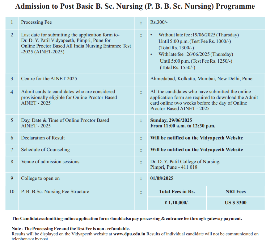 The minimum eligibility for admission to P.B.B.Sc Nursing at DPU is 10+2 WITH AIAHET.