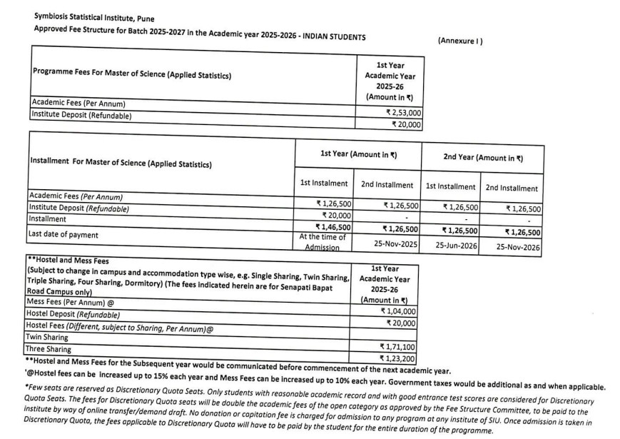 Earlier, M.Sc Applied Statistics fees at SIU Pune was ₹ 5.26 Lakhs (in 2024) for the entire course duration. This shows that the fee has remained unchanged since 2024.