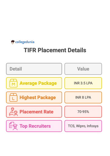 TIFR placement data for 2025 is officially not available for now. But as per the students' reviews on Collegedunia, the average and highest packages are as follows: INR 3.5 LPA and INR 8 LPA. 70-95% have been able to secure placements. Top recruiters at TIFR Placement are TCS, Wipro, and Infosys: