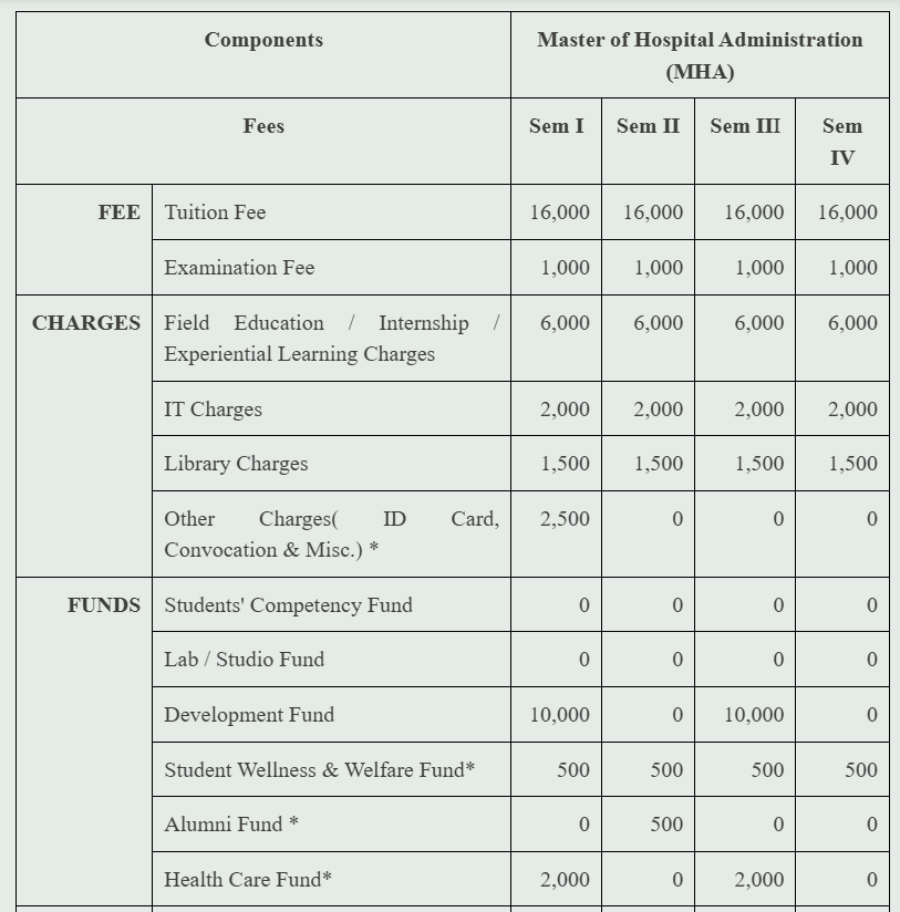 - The total fees for M.H.A [Hospital] Hospital Administration is ₹ 1.45 Lakhs.
