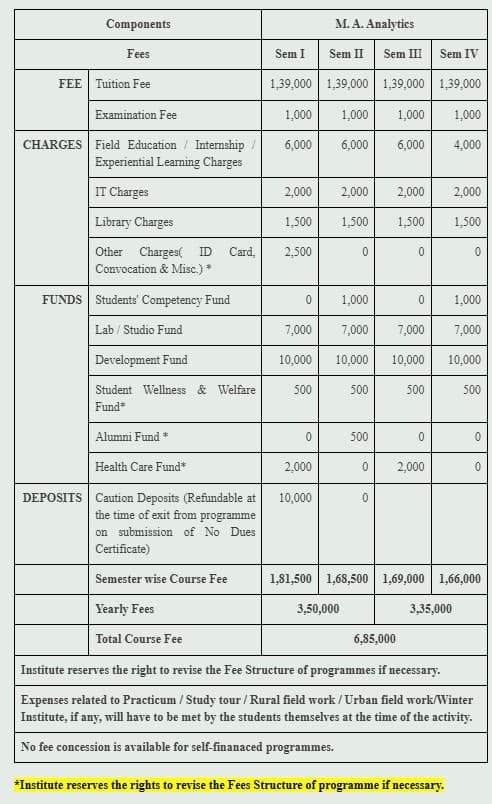 TISS Mumbai M.A. Analytics fees 2025 is ₹ 6.85 Lakhs for the entire course duration.