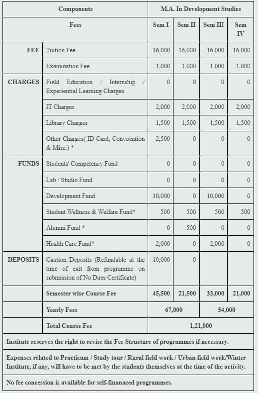 Earlier, MA Development Studies fees at TISS Mumbai was ₹ 1.21 Lakhs (in 2024) for the entire course duration. This shows that the fee has remained unchanged since 2024.
