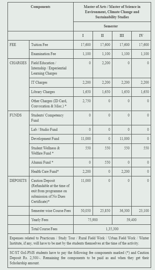 Earlier, MA Environment, Climate Change and Sustainability Studies fees at TISS Mumbai was ₹ 1.24 Lakhs (in 2024) for the entire course duration. This shows that the fee has remained unchanged since 2024.