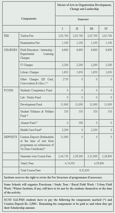 The total tuition fee for MA ODCL at TISS Mumbai is INR 8.49 Lakhs. Out of which INR 4.31 Lakhs is the first year fee and INR 4.18 is the second year fee. Hostels have separate charges. The hostel fees for SC/ST students is INR 18k per semester and the mess charges is INR 20k per semester.