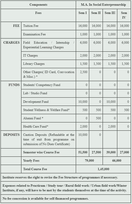 The semester-wise fees are Rs. 51,500 for Semester 1, Rs. 27,500 for Semester 2, Rs. 39,000 for Semester 3, and Rs. 27,000 for Semester 4. Additional fieldwork fees and expenses are the student's responsibility. Accommodation costs Rs. 38,000 per semester, with Rs. 18,000 for housing and Rs. 20,000 for dining, the latter being adjustable. These costs are reasonable compared to off-campus expenses in Mumbai.