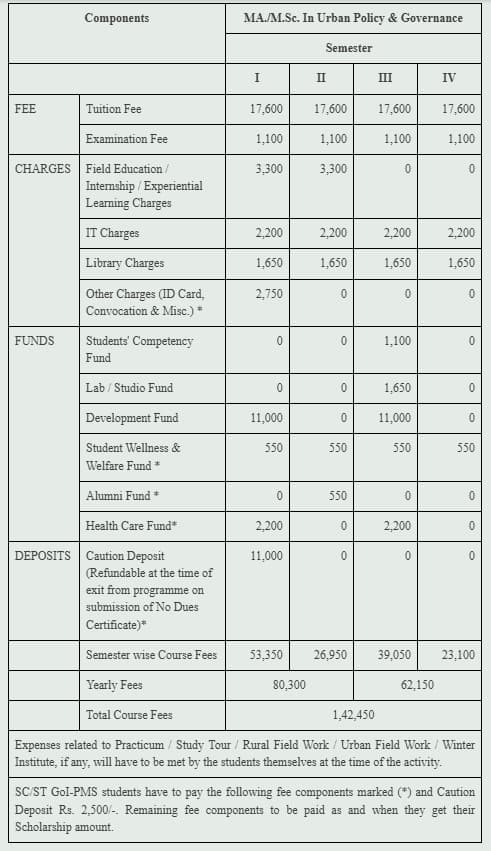 The Urban Policy and Governance program at TISS, Mumbai offers a dynamic and up-to-date curriculum led by distinguished faculty, including Dr. Manjula Bharaty and Professor Amita Bhide. With a faculty-to-student ratio of 1:4, the program ensures personalized attention and learning. Known for its strong placement record, the course successfully places nearly all students through its extensive alumni network and on-campus recruitment, with opportunities in government, NGOs, and corporate sectors. The program's 2-year fee is INR 72,000 for general and EWS students, INR 36,000 for OBC students, and it is free for SC, ST, and PWD students.
