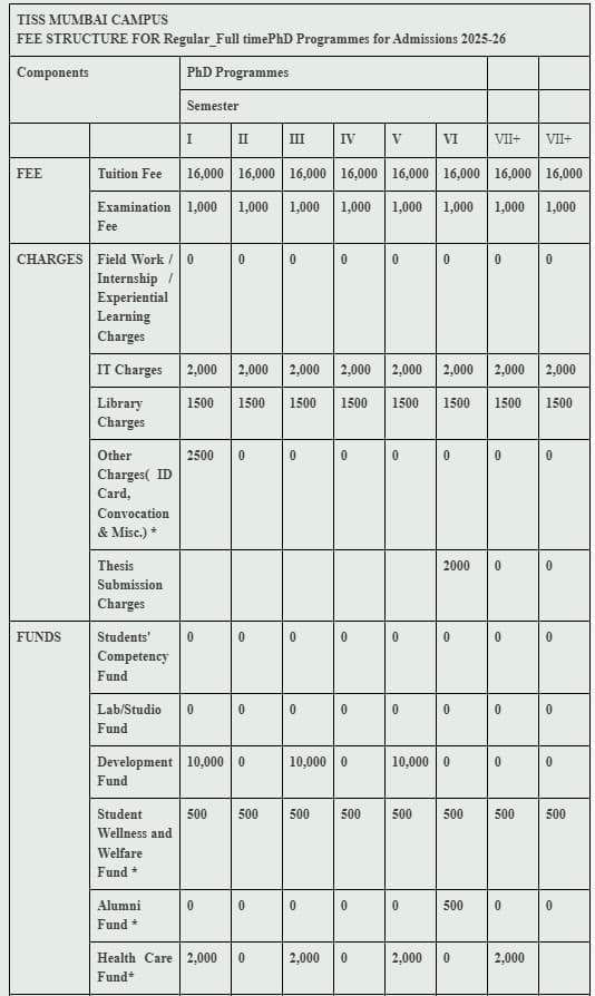 Earlier, Ph.D Social Work fees at TISS Mumbai was ₹ 2.21 Lakhs (in 2024) for the entire course duration. This shows that the fee has remained unchanged since 2024.