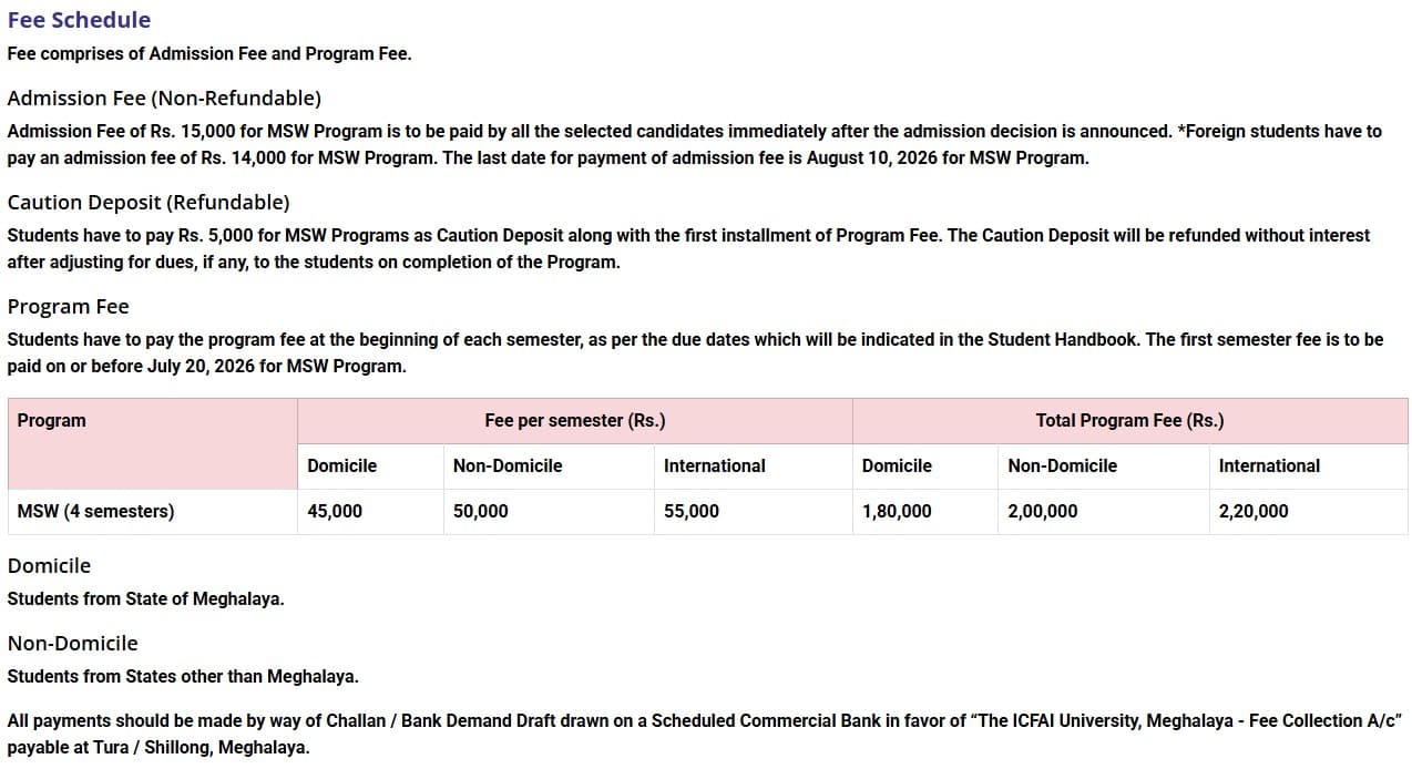 29 Nov, 2025 ICFAI University Shillong Fee Structure 2026 has been released for MSW programs. The total academic fee is ₹ 2 Lakhs.