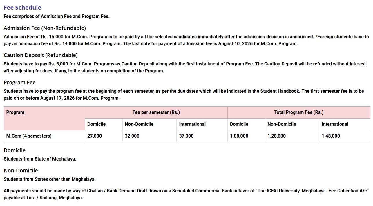 For students applying under the NRI quota for admission, the total course fee for M.Com at ICFAI University Shillong is ₹ 1.67 Lakhs.