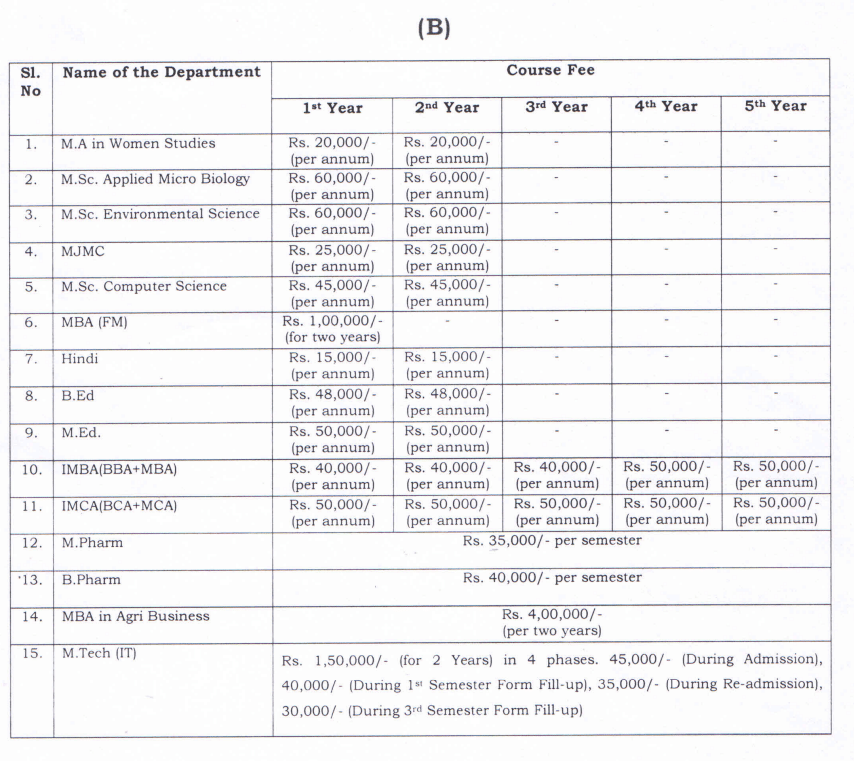 Scholarships for SC, ST, and OBC categories are available through the state portal, covering significant tuition and hostel fees. The combined BBA and MBA course costs INR 170,000, with tuition fees of INR 30,000 annually for the first three years and INR 40,000 for the subsequent two years, plus a yearly hostel fee of INR 15,000. Additional charges include a processing fee and exam fees. The university's website provides further details on fees, scholarships, and financial aid.