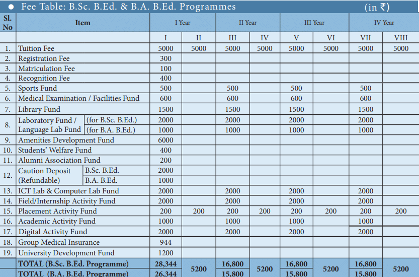 The college offers a 4-year integrated course that involves semester-wise exams in Education and a major paper, with lab exams preceding theory exams. Students benefit from excellent internship opportunities, including a compulsory teaching internship in the 3rd and 4th years, conducted in nearby schools within a 20km radius. The fee structure is detailed, with an initial fee of approximately 27,778 INR for the first semester. Odd semesters cost around 16,800 INR and even semesters about 5,200 INR, with a consistent tuition fee of 5,000 INR per semester.