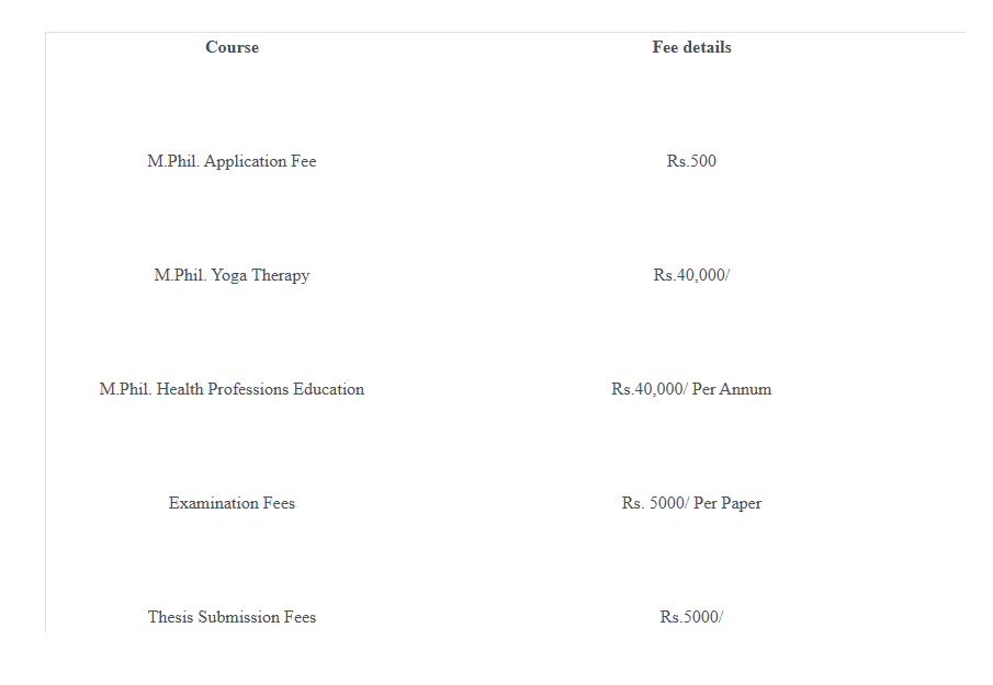 Sri Balaji Vidyapeeth University Pondicherry M.Phil Yoga fees in first year is ₹ 50,000. The detailed fees is mentioned below.Sri Balaji Vidyapeeth University Pondicherry Hostel Fee is ₹ 1.95 Lakhs to 2.5 Lakhs.