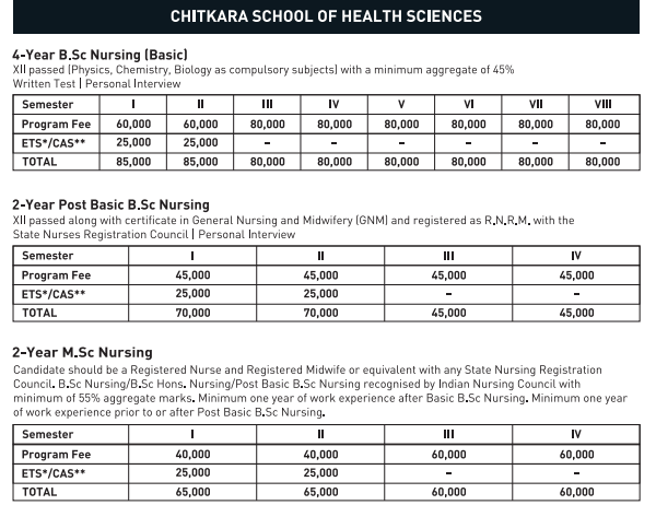 Earlier, B.Sc (Nursing) fees at Chitkara University (Patiala) was ₹ 6.4 Lakhs (in 2025) for the entire course duration. This shows a fee increase of ₹ 10,000 over the year.