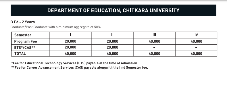 Earlier, B.Ed fees at Chitkara University (Patiala) was ₹ 1.6 Lakhs (in 2025) for the entire course duration. This shows that the fee has remained unchanged since 2025.