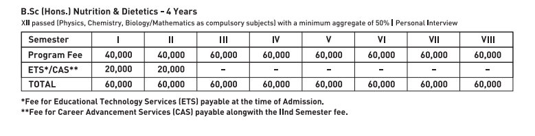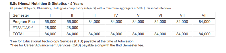 - The total fees for B.Sc {Hons.} Nutrition & Dietetics is ₹ 4.8 Lakhs.
