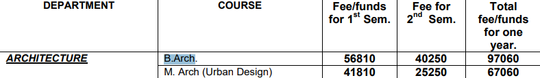 While the B. Arch program does not offer campus placements, it provides internship opportunities in various companies and government offices, enabling students to explore both private and public sector options. The total cost of education at this government university is approximately 6 lakhs. Tuition fees are set at 56,550 per semester, with additional costs covering funds (19,910), other funds (3,725), exam fees (4,800), amenities (900), and miscellaneous expenses (2,200). Merit-based scholarships can cover tuition fees for the even semester based on academic performance, while need-based scholarships provide a reduction of 20,000 on even semester fees.