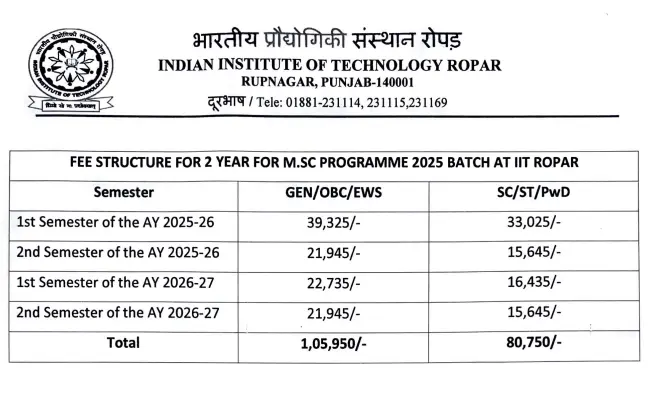 Earlier, M.Sc Chemistry fees at IIT Ropar was ₹ 1.01 Lakhs (in 2024) for the entire course duration. This shows a fee increase of ₹ 1.35 Lakhs over the year.