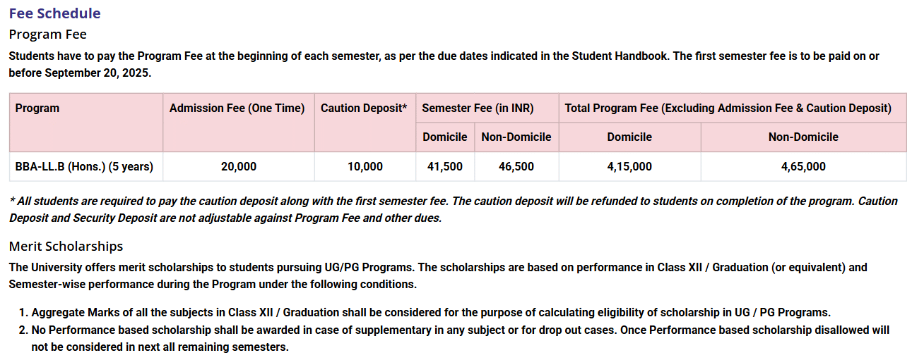 - This includes a total tuition fee of ₹ 4.15 Lakhs, Caution Fees of ₹ 10,000, Other Fees of ₹ 20,000.