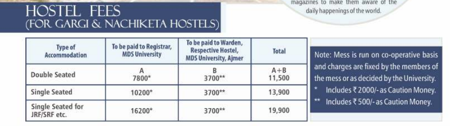 The hostel at Maharshi Dayanand Saraswati University, Ajmer, offers good facilities including clean and sophisticated rooms equipped with plug points, wardrobes, and attached latrines. The hostel charges an average monthly fee of 2000 INR, which includes meals provided by the mess. Rooms accommodate four students, each with a separate bed, cupboard, table, and chair, along with amenities like two fans, a cooler, and windows.