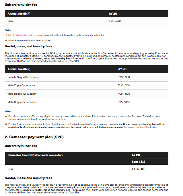 Earlier, BBA fees at NIIT University Neemrana was ₹ 9.61 Lakhs (in 2025) for the entire course duration. This shows a fee increase of ₹ 1.1 Lakhs over the year.