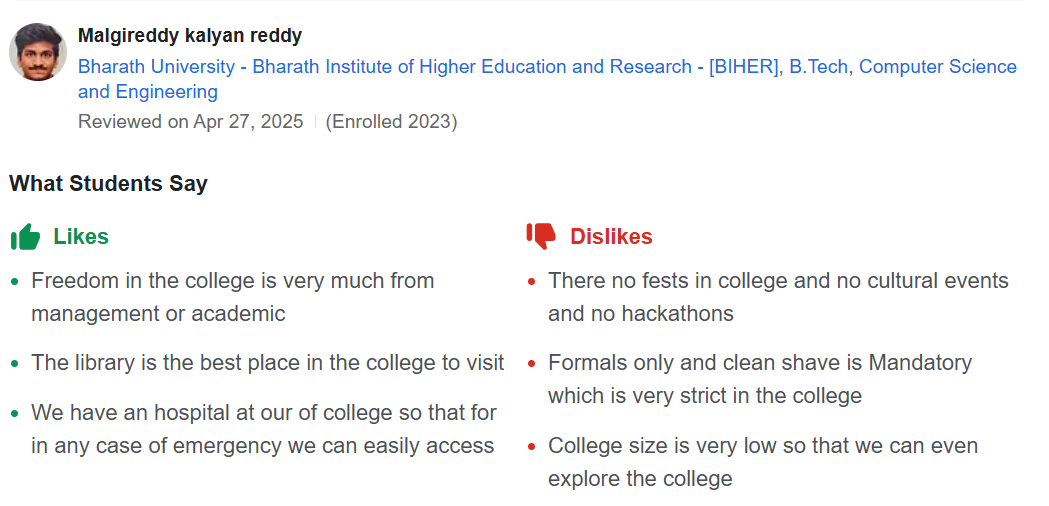 See what Malgireddy Kalyan Reddy from B.Tech, Computer Science and Engineering (Enrolled 2023) at Bharath University - Bharath Institute of Higher Education and Research - [BIHER] has to say about his college experience: