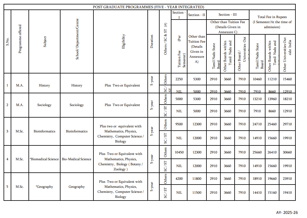Bharathidasan University Tiruchirappalli BA + MA Sociology is offered as 5 Years Full Time program. The minimum eligibility criteria for BA + MA is 10+2. The total fees for Bharathidasan University Tiruchirappalli BA + MA Sociology in 2025 is ₹ 96,100 for the complete course duration, which includes total tuition fees of ₹ 96,100. Earlier, the fees in 2020 - 2021 for BA + MA Sociology was ₹ 1.07 Lakhs.