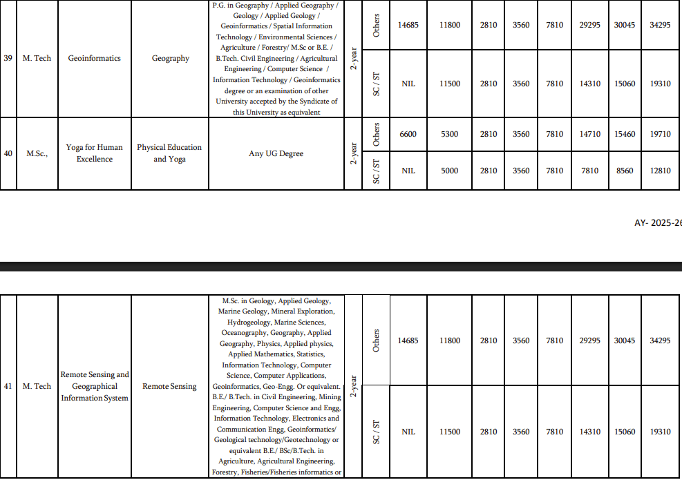 Bharathidasan University Tiruchirappalli M.Tech Geoinformatics is offered as 2 Years Full Time program. The minimum eligibility criteria for M.Tech is Graduation with 50% + TANCET. The total fees for Bharathidasan University Tiruchirappalli M.Tech Geoinformatics in 2025 is ₹ 1.01 Lakhs for the complete course duration, which includes total tuition fees of ₹ 1.01 Lakhs. Earlier, the fees in 2020 - 2021 for M.Tech Geoinformatics was ₹ 1.06 Lakhs.