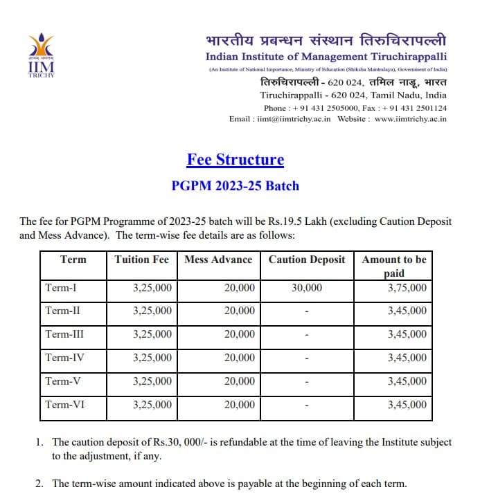Earlier, PGPM fees at IIM Trichy was ₹ 19.5 Lakhs (in 2024) for the entire course duration. This shows that the fee has remained unchanged since 2024.