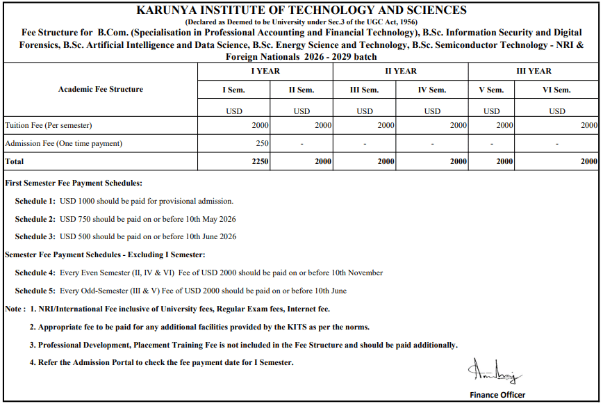 For students applying under the NRI quota for admission, the total course fee for B.Sc Information Security & Digital Forensics at Karunya University is ₹ 10.78 Lakhs.