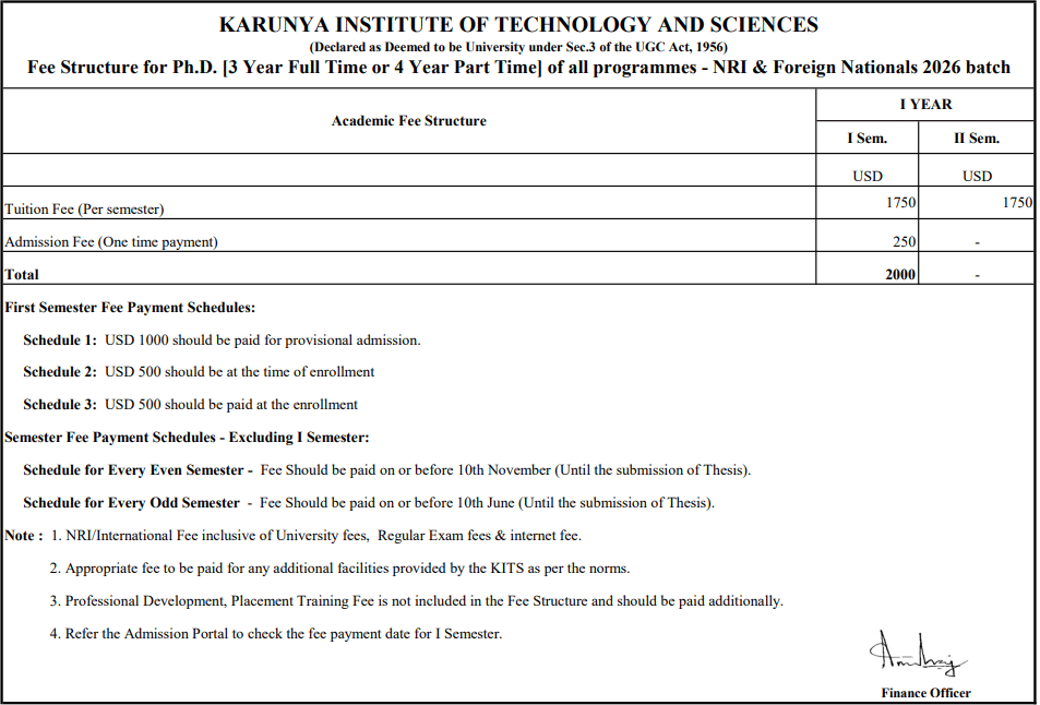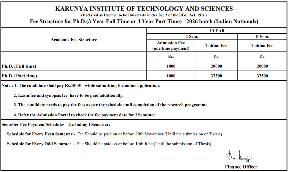 14 Nov, 2025 Karunya University has also released PhD Fee Structure 2026. The total academic fee is ₹ 3.01 Lakhs. For more details, click here.