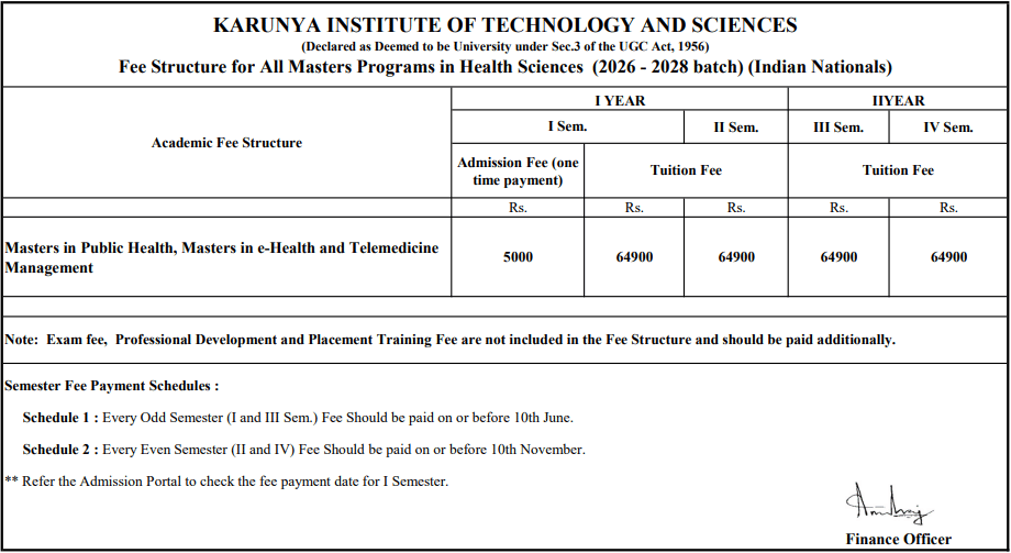 14 Nov, 2025 Karunya University has released MPH Fee Structure 2026-27. The total academic fee is ₹ 2.65 Lakhs. Check details.