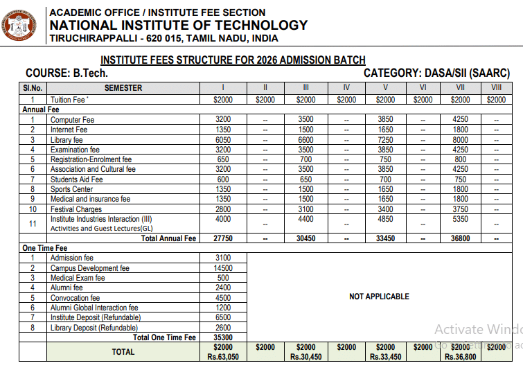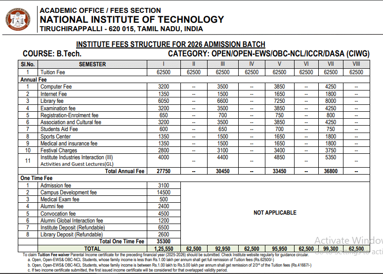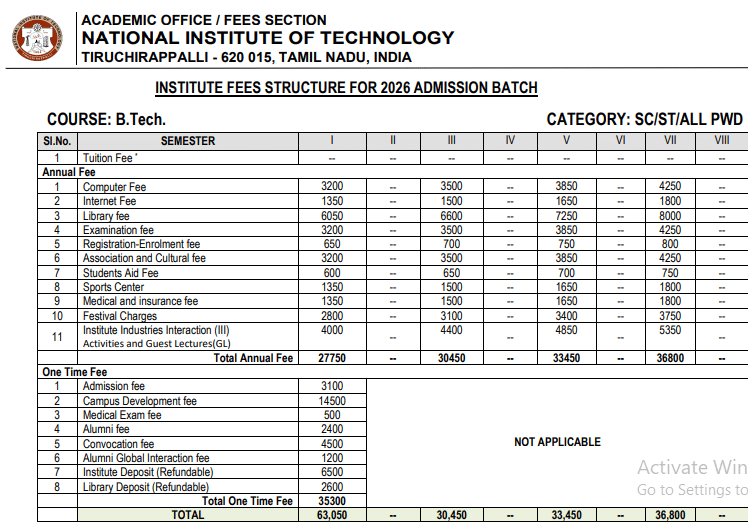 Earlier, B.Tech Civil Engineering fees at NIT Trichy was ₹ 6.52 Lakhs (in 2025) for the entire course duration. This shows a fee increase of ₹ 11,650 over the year.