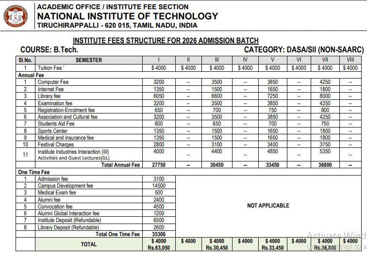 - NIT Trichy Hostel Fee is ₹ 1.07 Lakhs.