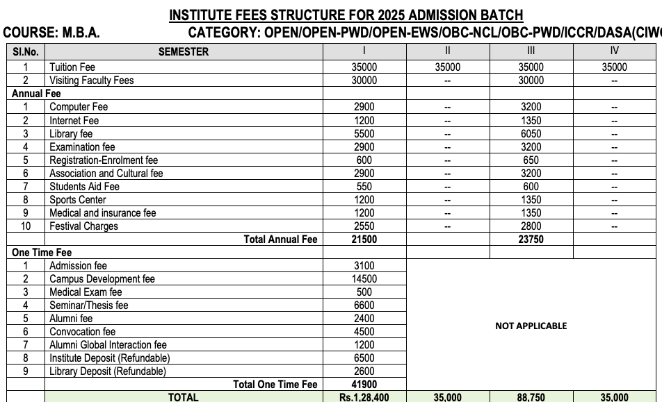 Earlier, MBA fees at NIT Trichy was ₹ 2.79 Lakhs (in 2024) for the entire course duration. This shows a fee increase of ₹ 7,950 over the year.