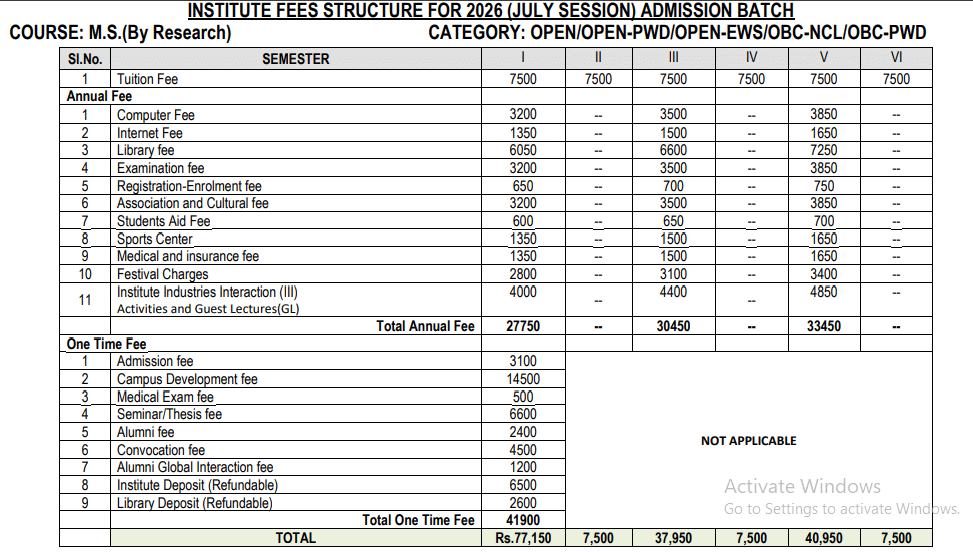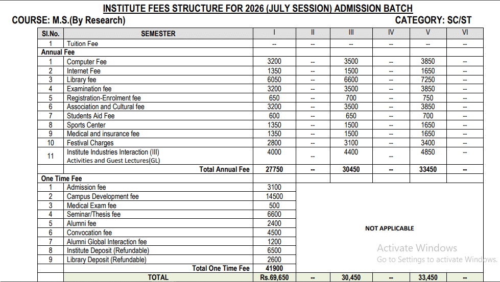 - For SC/ST category students, the total fees is ₹ 1.34 Lakhs.